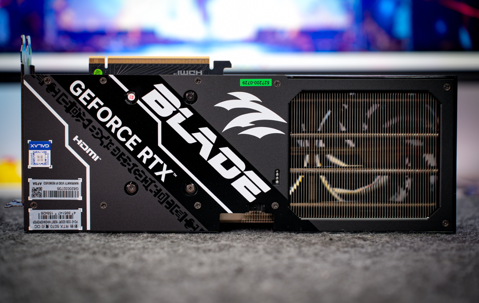 影驰GeForce RTX 5070魔刃OC显卡背面依然是采用了一体式金属背板,印有刃系列的logo以及BLADE字样的标识,并且尾部还保留有大面积镂空的设计,用于强化显卡的散热。