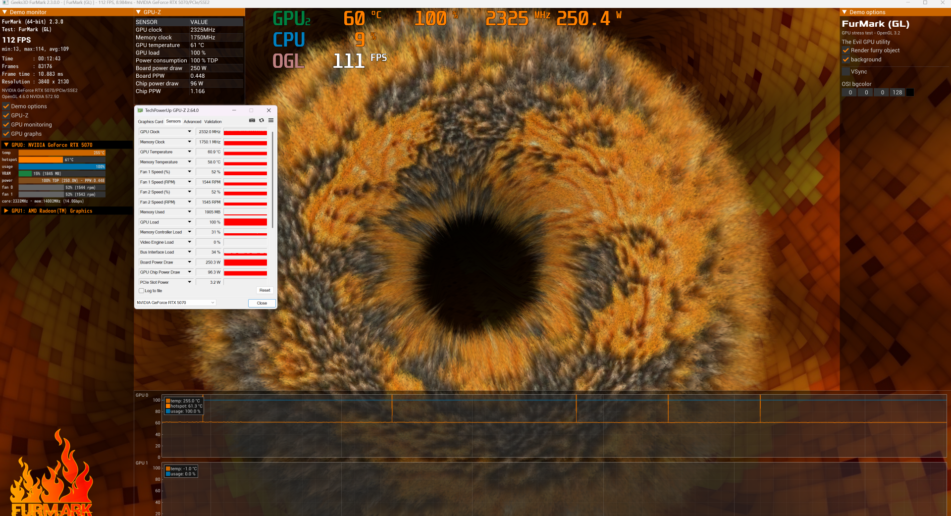 在室温21℃的情况下通过FURMARK 2拷机实测,影驰GeForce RTX 5070魔刃OC满载功耗最大功耗在250.4W左右,不过温控表现非常出彩,GPU核心温度仅为60℃。