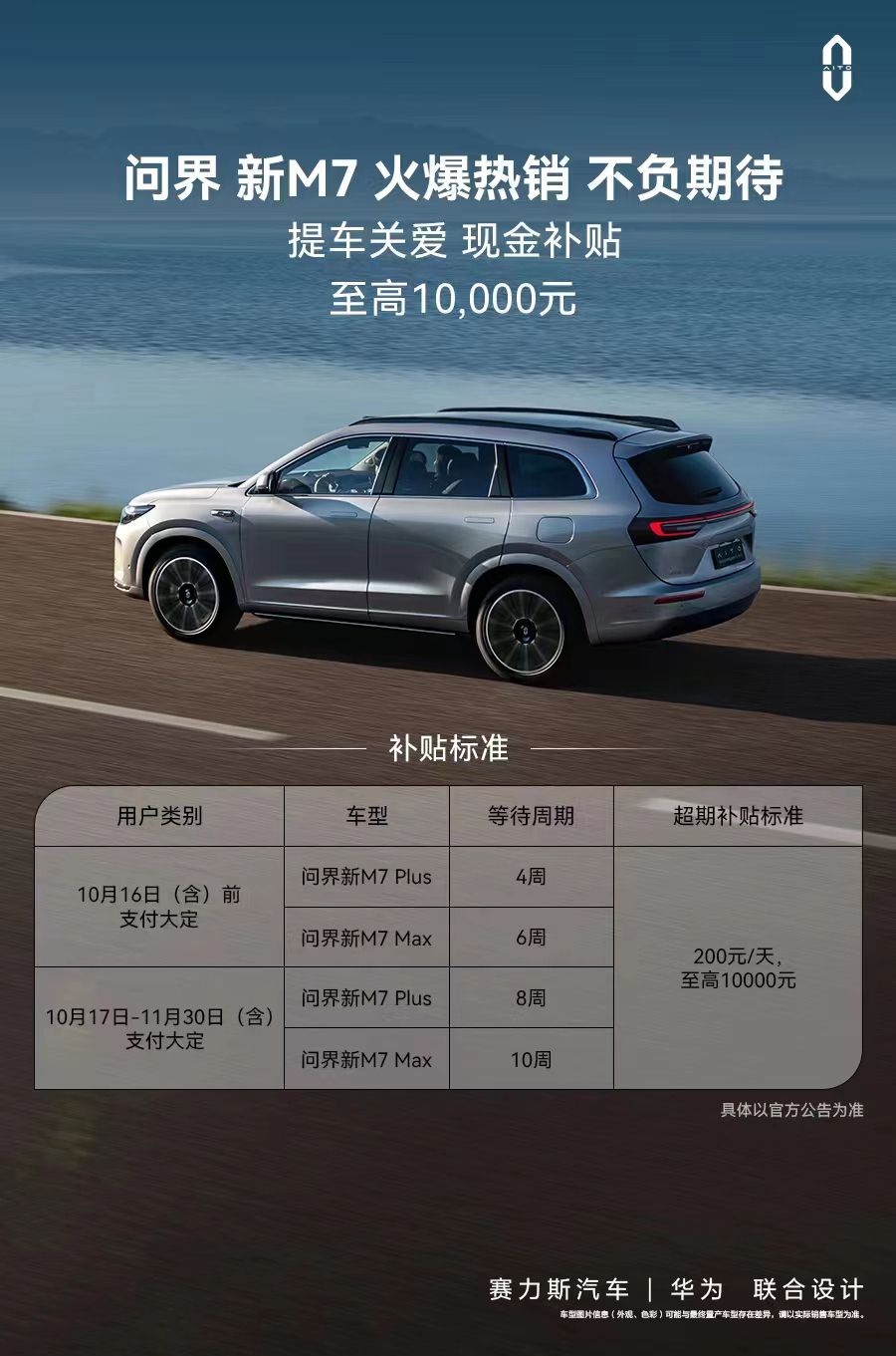 据悉,AITO问界还推出了“新M7提车关爱计划”,于2023年11月30日(含)前完成大定支付的AITO问界新M7用户,AITO APP上订单状态自“交付方案已确认”之日起,到“车辆已到店”之日止,如超过相应等待周期,用户将享受提车关爱现金补贴,根据超期天数,用户可享受200元/天的现金补贴,至高享1万元。