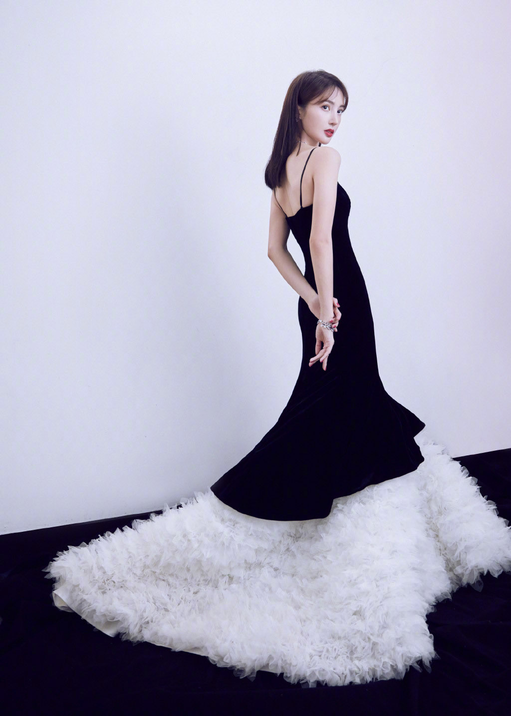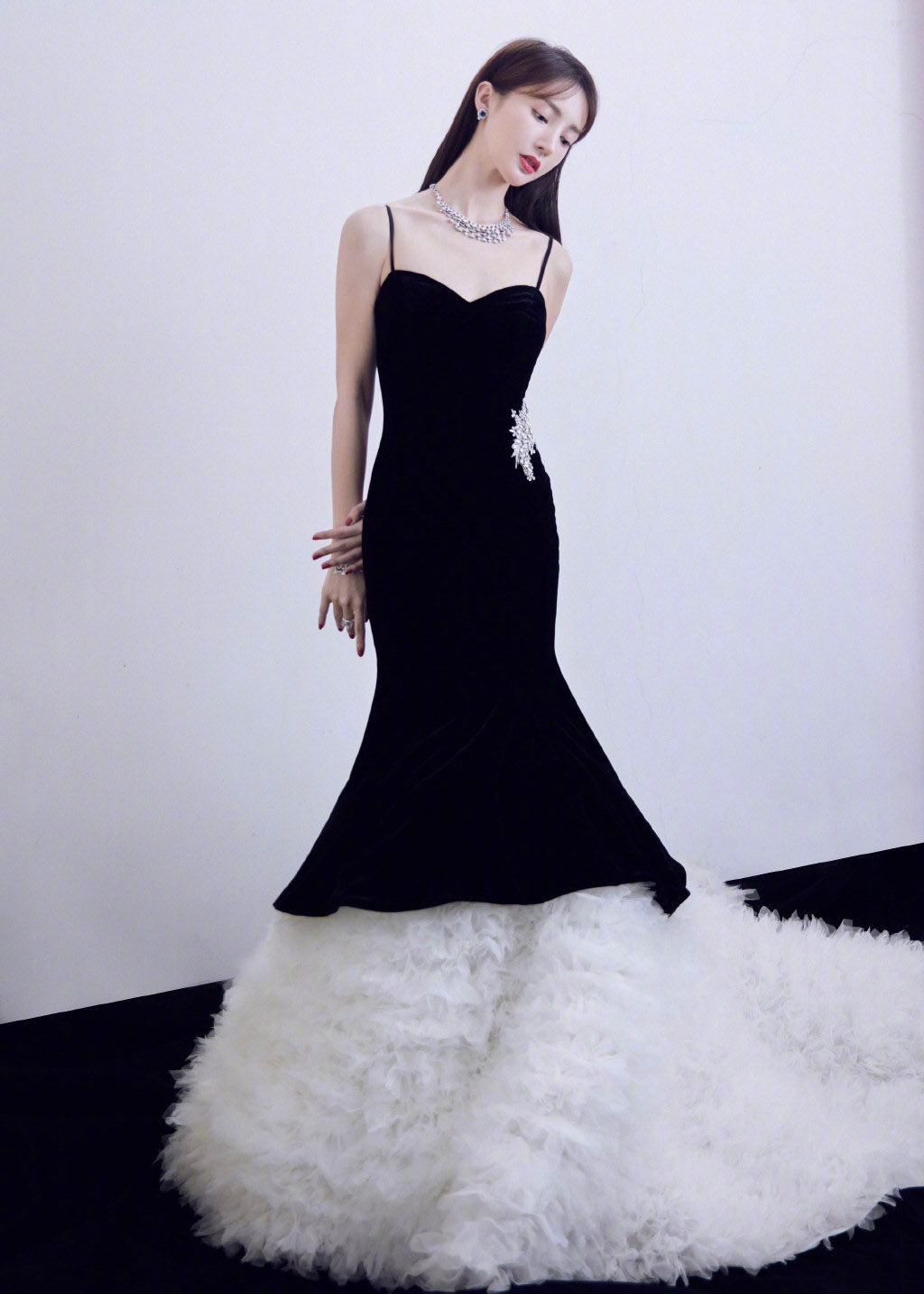 而裙子的亮点在裙尾,曳地的款式首先给人的感觉就增加了气质与高级的敢接,白色羽毛百褶的设计更是让金晨的气质散发出来了,黑色look的裙子配上白色曳地的款式打造出了人物的层次感,很时尚高级,不得不说,许久未见的金晨这次出席活动美得不低调啊!