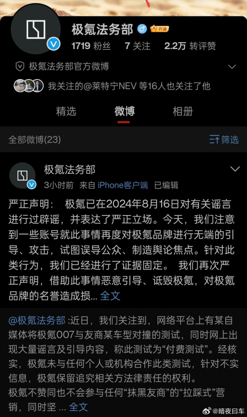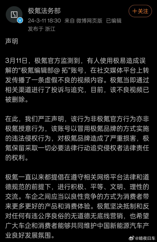 但你要是顺着两家法务部的微博往深了挖,就会发现,极氪法务部在去年3月发过一条,大概就是有个自媒体账号挂着极氪的名字,给友商车型的视频配了鬼畜音乐后,极氪官方亲自下场与其撇清关系并让其删除视频。