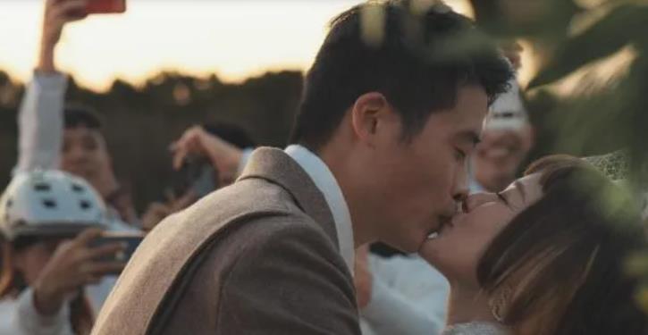 新郎紧紧地把她拥入怀里,两人深情亲吻对方,十分甜蜜。