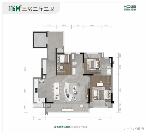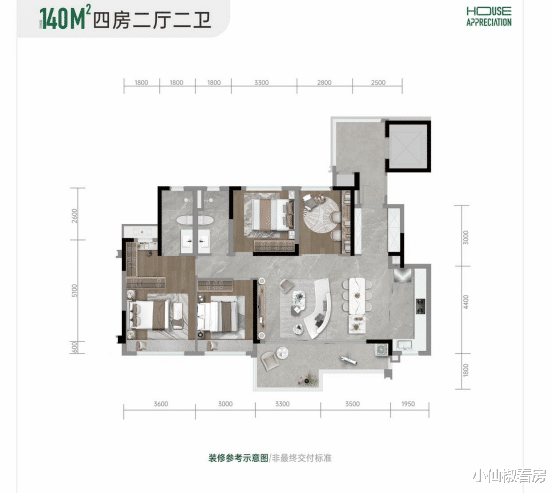 因为面积大,除了书房,其他三间卧室的开间都在约3米及以上,整体就更均衡。