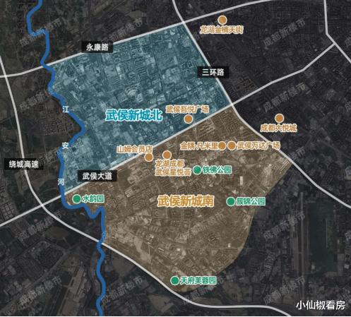 武侯新城是以武侯大道武兴路为分界线将武侯新城一分为二,武侯新城的南北两侧的配套丰富度、发展重心有着显著区别。