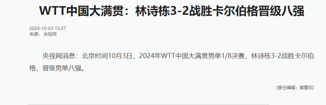 信息来源:央视网于2024年10月3日发布的——《WTT中国大满贯:林诗栋3-2战胜卡尔伯格晋级八强》