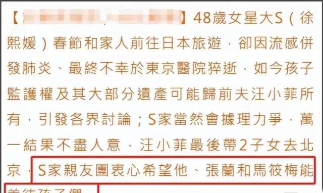 据传,大S在生前为自己安排了一份遗嘱,将个人财产留给了母亲和两个孩子。