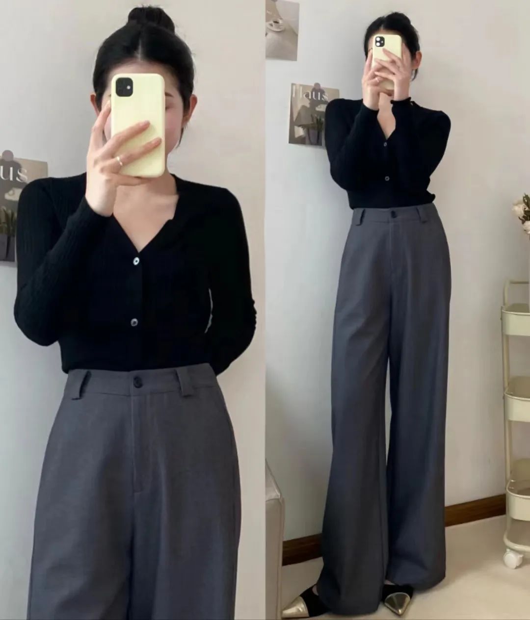 像上面这位博主,就是用一件修身的长袖针织衫搭配西装阔腿裤,简约又不失时尚感。