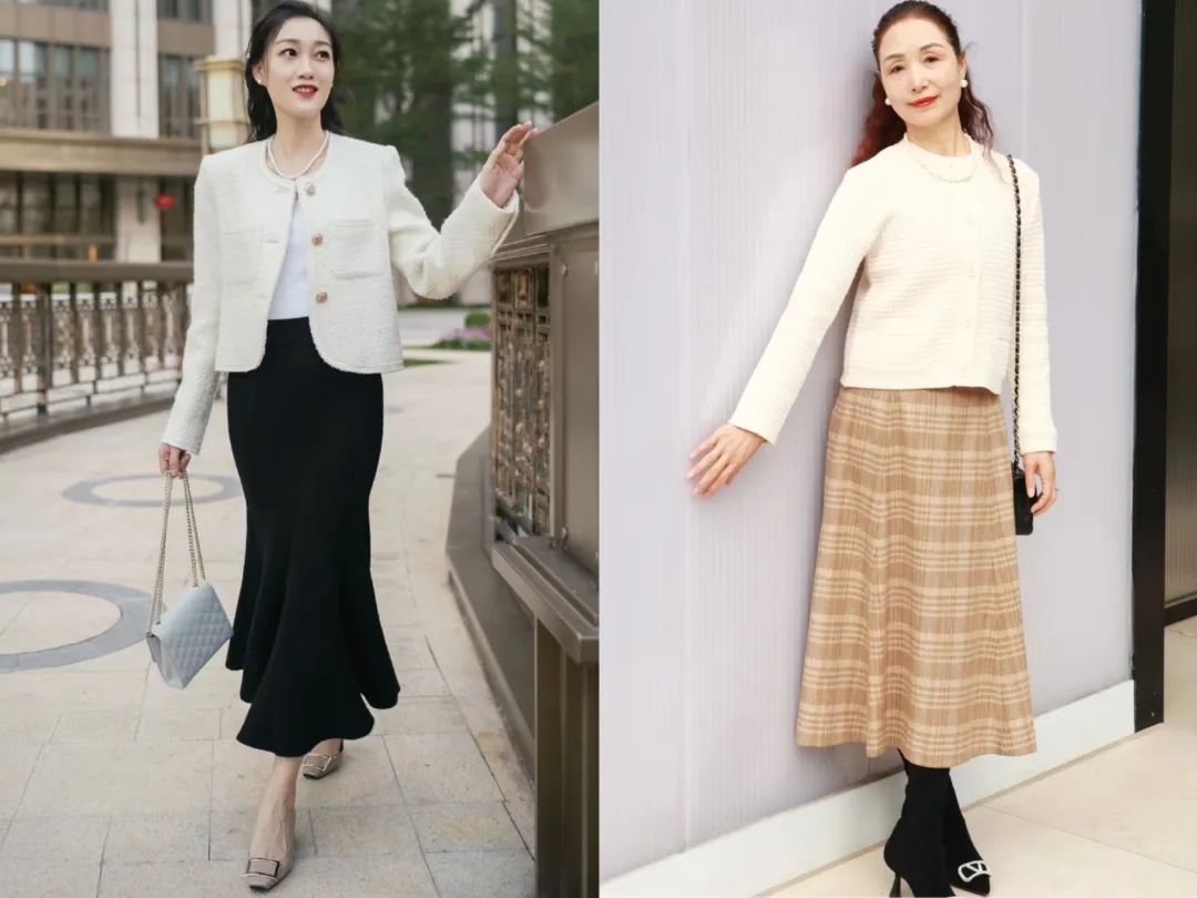 比如上半身白色小香风外套,下半身黑色鱼尾半身裙,黑白经典搭配,能很好地突显出女人味。这样的穿搭不仅适合日常出街,也完全能够应对一些正式的场合。