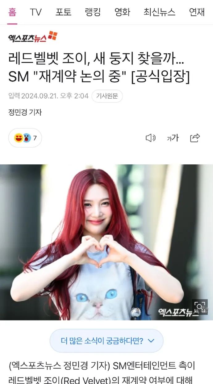 Red Velvet成员Joy朴秀荣与经纪公司SM的十年合约即将到期,刚还被传出她与演员管理公司见面,准备转社,正在物色演员所属公司。