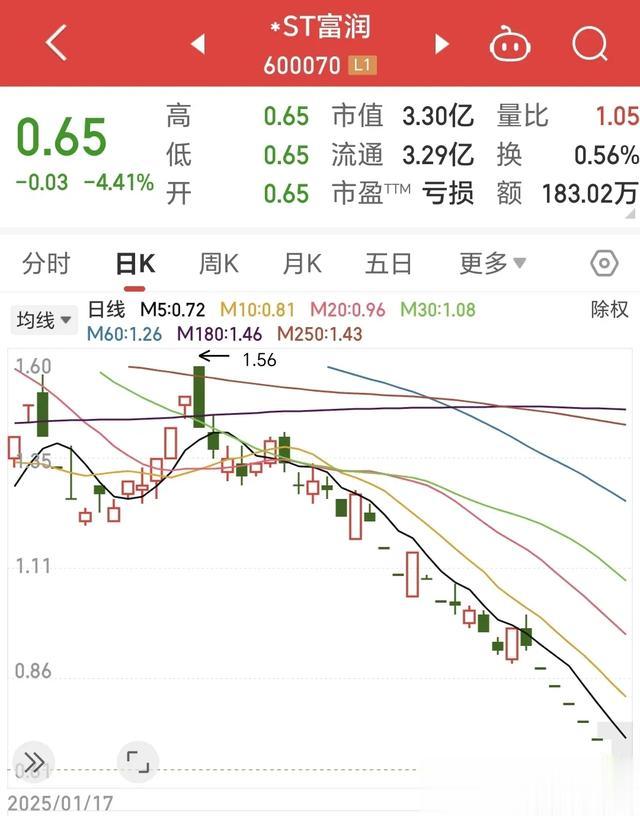 *ST富润,今天收于0.65元,已经连续11个交易日收盘价低于面值一元,同时,公司的市值也连续11个交易日低于五亿元,同时面临面值退市和被市值退市的风险,留给他的时间也已经不多了。