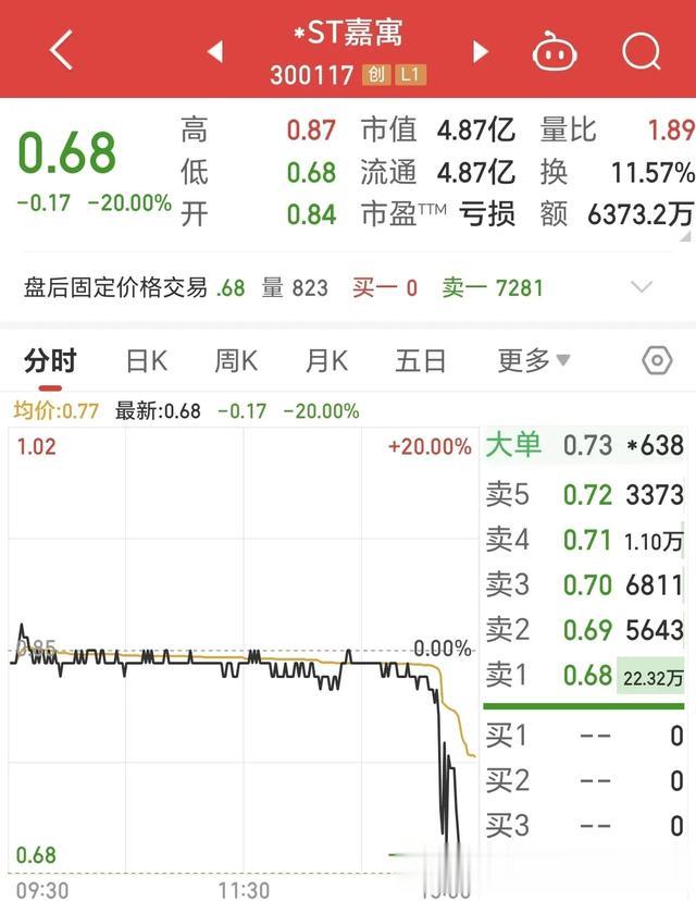 *ST嘉寓,今天临近尾盘之际,股价突然闪崩,仅用了10分钟时间就直接封于20%跌停板,股价收于0.68元,这已经是该股的连续18个交易日收盘价低于面值一元,如果明天的收盘价不能高于0.83元,那将彻底无望,告别主板。
