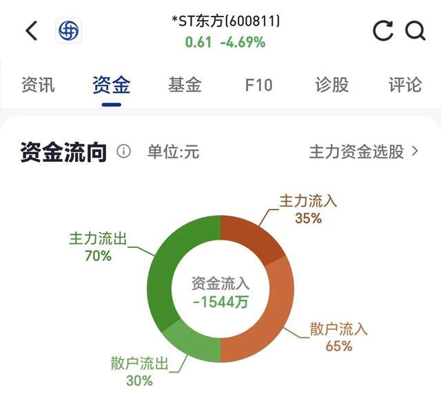 *ST东方,今天收于0.61元,其已连续9个交易日跌破面值一元,收盘时的跌停封单还多达490万手,不过今天的成交量明显放大到4366万元,换手率1.96%,从资金流向来看,主力净流入35%,散户净流入65%,表明还是有一定的资金有参加其最后博弈的趋向。