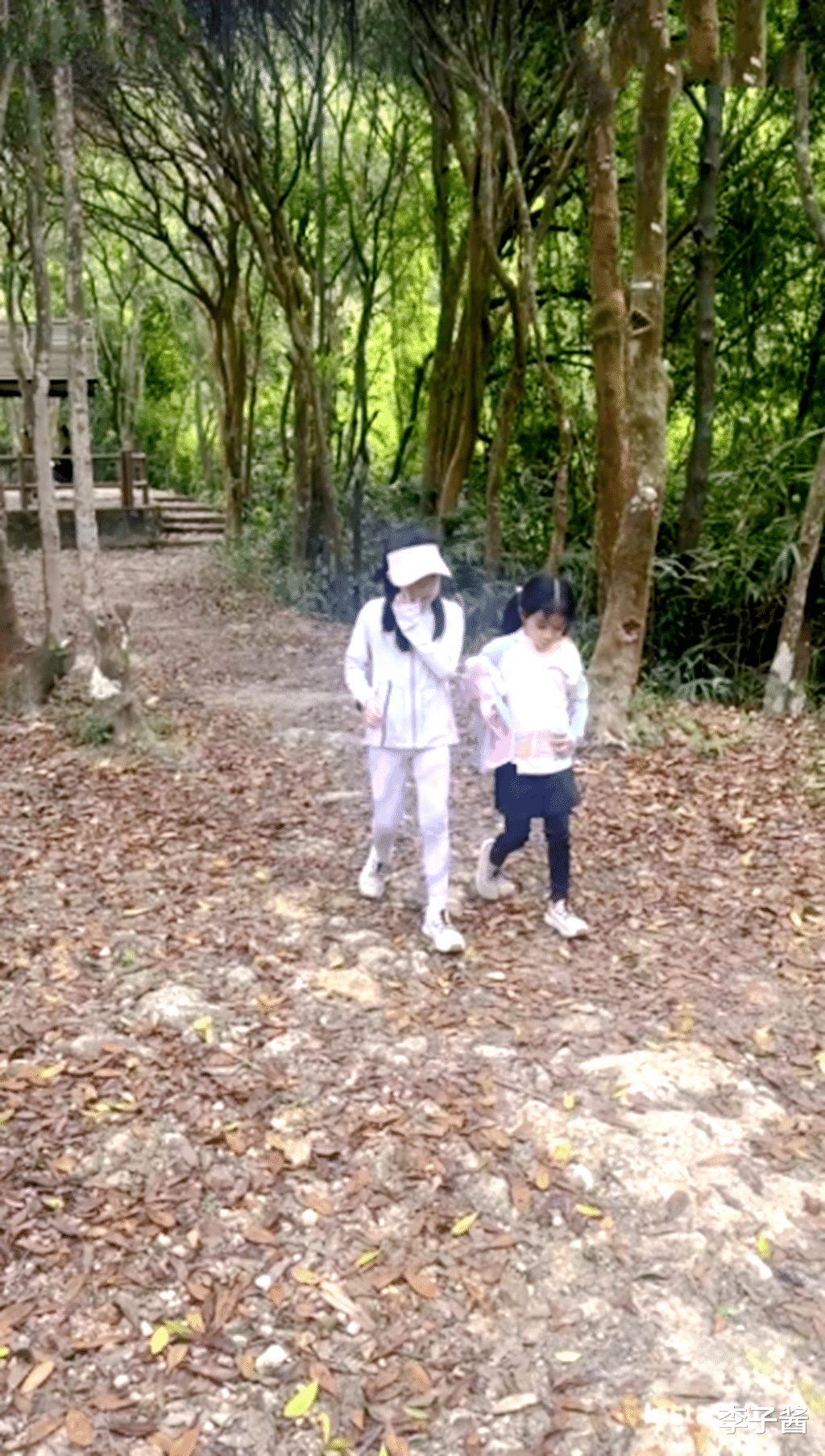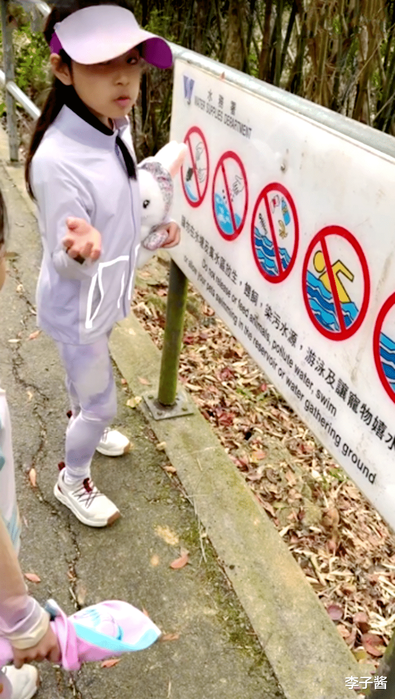 不知道为什么,郭晶晶的大儿子没有现身,也许是参加其他活动去了,所以就没有跟着爸爸妈妈。在爬山户外活动中郭晶晶走到一个地方就教女儿辨别路标以及在户外公众场合应该懂礼貌不要做破坏自然的事情,期间郭晶晶走到一个湖边,还让两个女儿看附近的告示,告诉他们在这附近不能遛狗,不能游泳,不能乱扔东西等等。