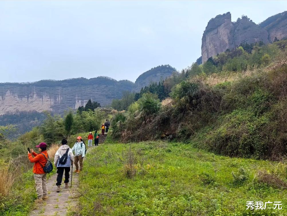 顺绝壁底部前行,一路风光无限,鸟瞰山下,层峦叠嶂,牛头山,人头山轮廓分明,金黄色的油菜花铺满大地,弯弯曲曲,特别秀美。山林之中,初吐嫩芽,绿的红的,都十分醒目,春风吹拂,人在画中。