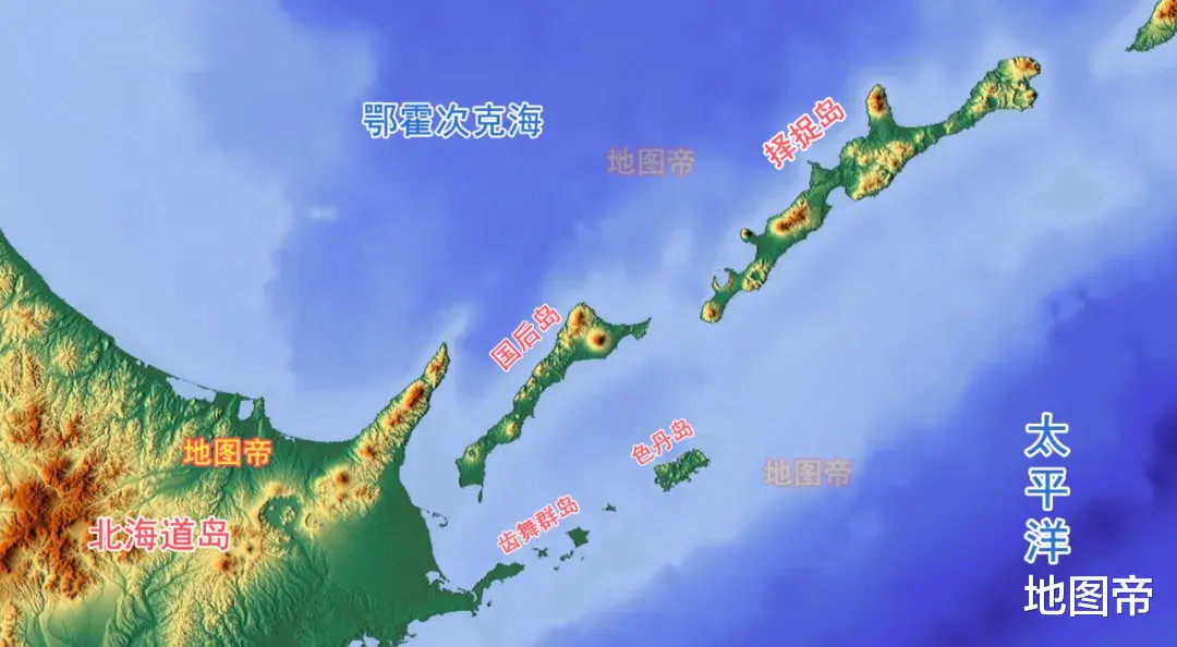 北海道岛东北方向,有一组岛屿,日本称北方四岛,俄罗斯称南千岛群岛,位于千岛群岛南部,俄罗斯实际控制,日本念念不忘。