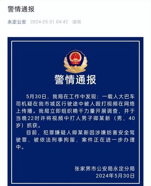 当晚深夜,张家界警方发布了情况通报,表示他们接到警情之后,当晚就将打人导游抓获了,目前男子以涉嫌妨害安全驾驶罪,被刑事拘留了。