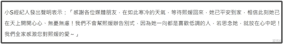 称大S已经平安到家,相信她在天国会开心无忧,并且透露不会举办告别仪式,大S一直都很低调,请大家把对大S的思念放在心中。