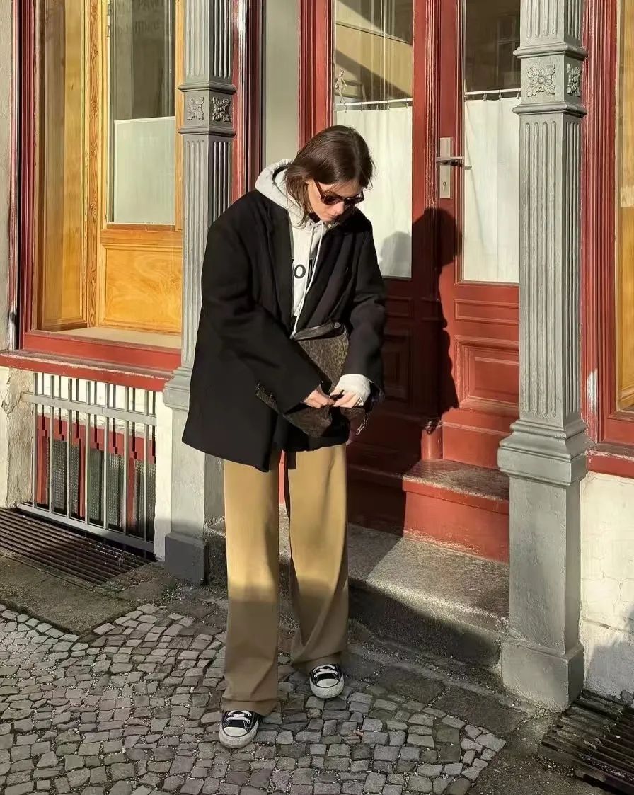 将一件连帽卫衣作为内搭,外穿一件西装外套或风衣,再搭配一条高腰阔腿裤和一双尖头高跟鞋,既能展现出女性的优雅气质,又不失时尚感。