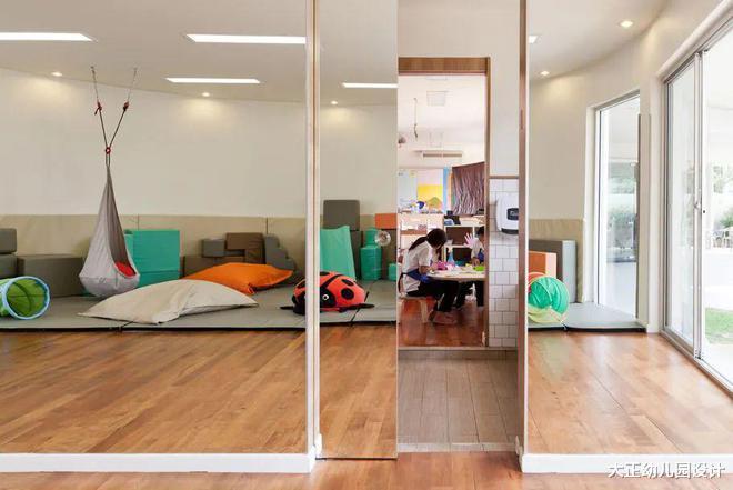 活动室内大面积使用落地镜,配合开阔的窗户,让整个空间从视觉效果上更加广阔、明亮。孩子们在内玩耍时,不易产生烦闷感。