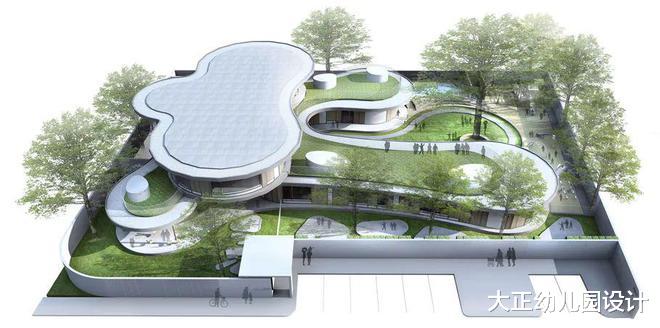 建筑外部是大片绿地,为孩子们提供了自由奔跑、游戏的场地。设计师还通过巧妙的曲线设计,组成一个类似中庭的半开放户外空间,既保证了采光通风,也有利于调节小气候。