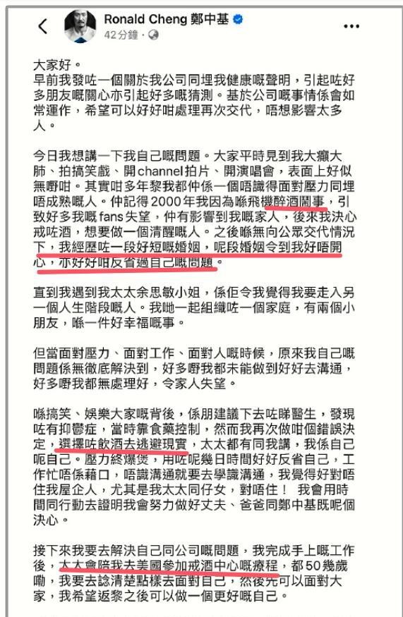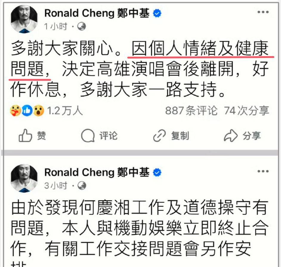 后来郑中基发长文回应解约,不但没说清楚和女经纪人结束合作的原因,还莫名其妙提到前妻阿Sa,说“那段婚姻很不开心”,被网友痛批“拉踩前任立人设”。他还承认自己酗酒、患有抑郁症,去美国戒酒。可他这回应,不但没让事情平息,反而让大家更加怀疑他和经纪人之间的关系。