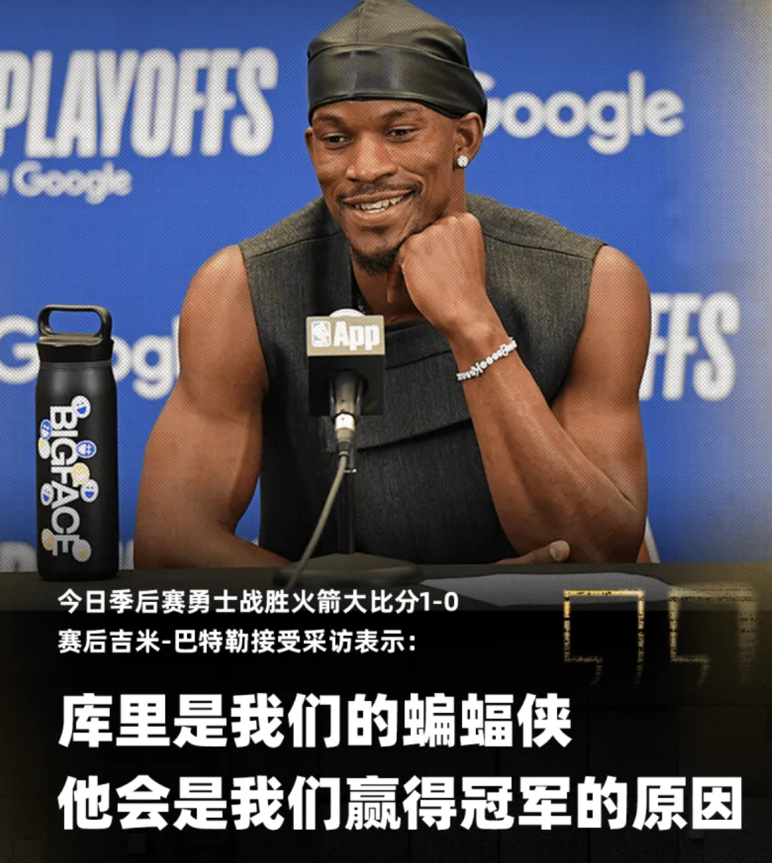 赛后,勇士球员吉米-巴特勒接受了记者采访,谈到了队友库里在比赛中的几个高难度三分:
