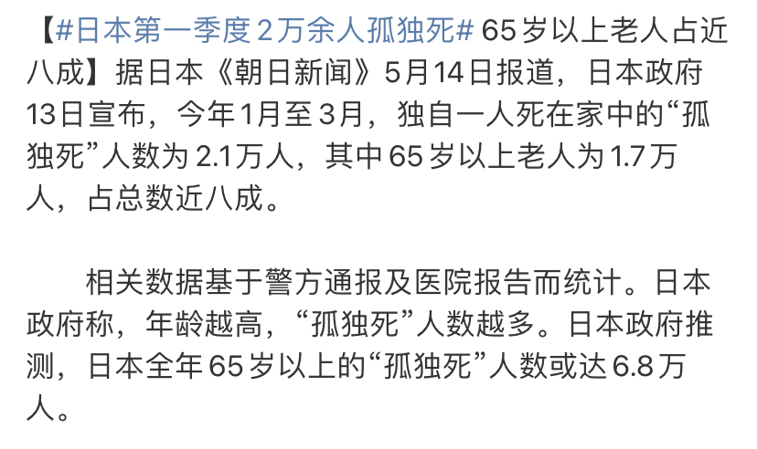 根据日本政府统计,2024年,日本第一季度超2万独居者在家中孤独离世,其中65岁以上老人占比高达80%。并且根据预测,日本全年65岁以上的“孤独死”人数或达6.8万人。