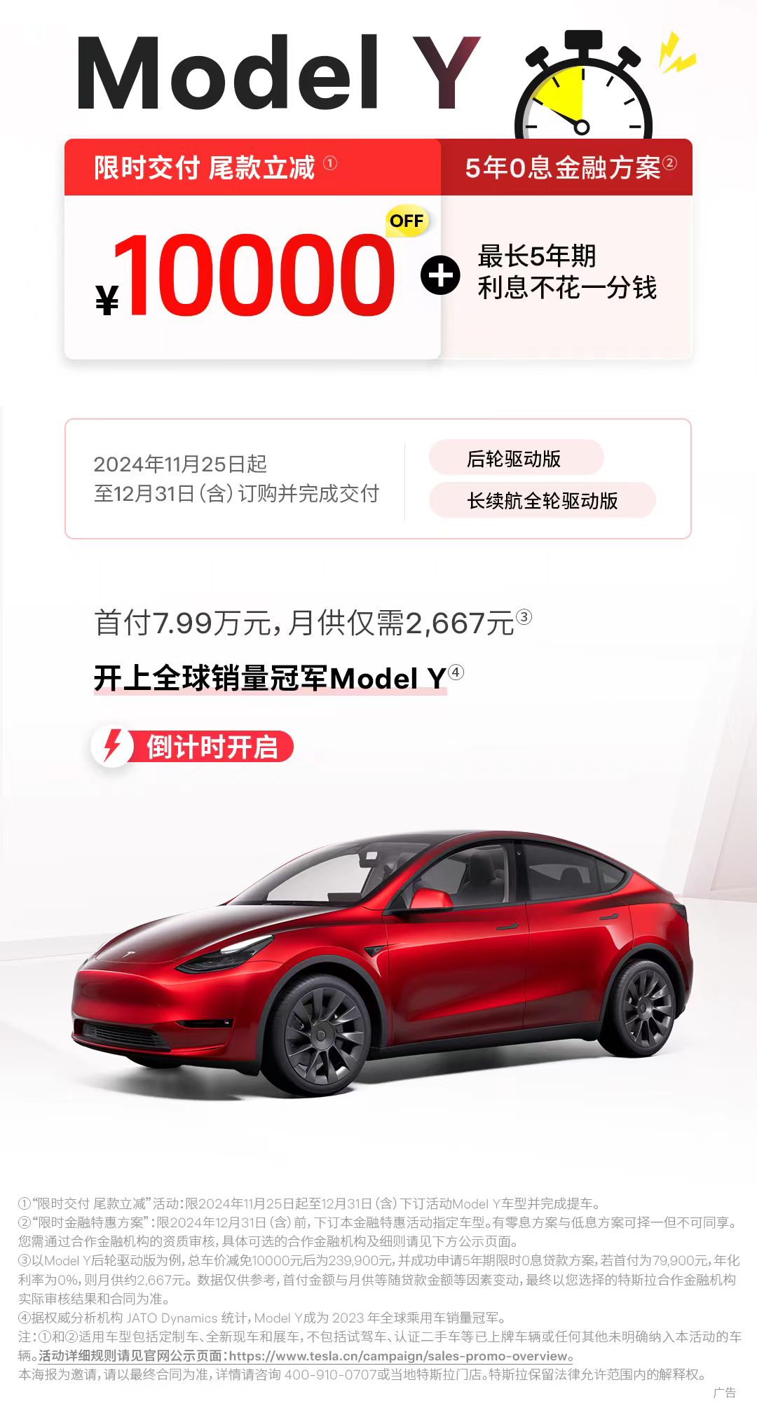 近日,特斯拉上线“限时交付 尾款立减”政策,12月31日前提走特斯拉,Model Y后轮驱动版及长续航全轮驱动版车型尾款立减10000元。同时,特斯拉5年0息金融方案已延期至12月31日。这意味着,每月仅需2667元起,就能入手一台全球销冠车型,Model Y已迎来历史最低、全球最低入手价。