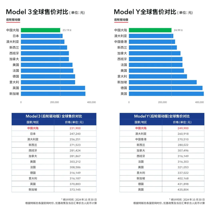 Model Y不仅是中国今年目前卖得最好的乘用车,也是1-10月全球电动车销冠。在欧洲、美洲、亚洲等地的多个国家,特斯拉的热销也创下了佳绩。在欧洲市场,特斯拉位居豪华车销量榜首,在西班牙、意大利和捷克市场,Model 3和Model Y更是包揽11月最畅销电动车的冠亚军;在亚洲市场,2024年特斯拉在韩国的注册量增速迅猛,10月韩国40%的进口电动车都是Model Y,该车型也跻身当地10月最畅销乘用车前三名;在美洲市场,特斯拉在美国加州电动车市场的市场份额高达54.5%,Model Y、Model 3和赛博越野旅行车成为当地最受欢迎电动车前三名,赛博越野旅行车也成为美国其细分领域销量最好的车。