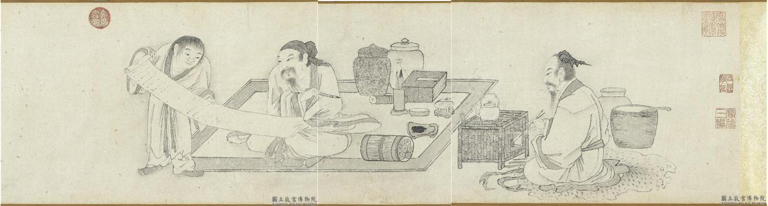 在台北故宫博物院典藏一幅王问的《煮茶图》,此卷画于嘉靖三十七年(1558),根据这幅画作的说明,左面主人于(湘妃)竹罏" ignoretag="true">罏前,聚精会神地挟炭烹茶,罏上置提樑茶壶;对面文士展卷挥毫,状态愉悦。席上备有笔、砚、香炉、书卷等。