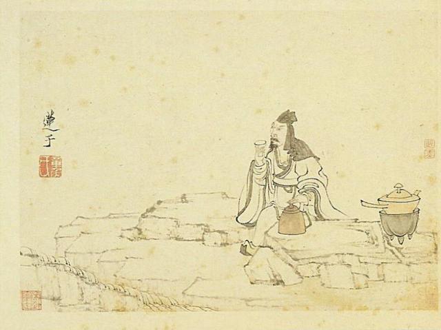 崇祯十六年(1643),陈洪绶南归隐居绍兴,《隐居十六观》是陈洪绶晚年的作品。〈谱泉〉画中,画家一人独啜曰神,一手持白瓯,一手抚紫砂壶,一旁茶炉上还有一只正烧煮水的单柄汤铫。状似画家才将茶汤注至茶瓯,正准备品饮一壶好茶。这时侍茶的僮仆不见了,紫砂壶的样式显得更加质朴,似乎反映了当时的政治情势及文人的心态:紫砂壶越来越属个人的清玩,而饮茶也就是越来越个性化,成了文人生活中不可或缺的一部分。