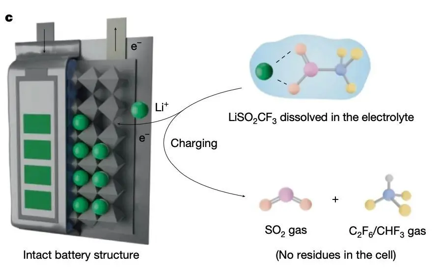 长期以来,由于满足上述条件的物质极为罕见,该领域研究进展缓慢。而复旦团队借助人工智能技术,从240种候选分子中筛选,最终锁定了一种名为LiSO₂CF₃的化合物。该分子在电池内发生反应后,生成二氧化硫和氟碳类气体,这些气体能够经由电池排气孔逸出,不会残留,避免了二次污染。
