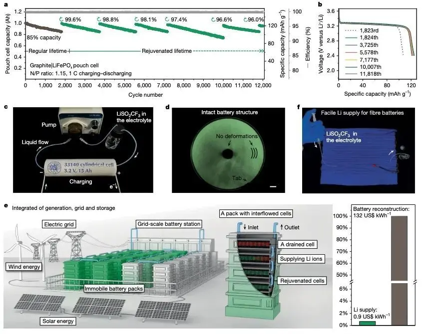 研究团队在实际实验中验证了该物质的效果。他们对一块老化的磷酸铁锂电池注入这种“补锂剂”后,电池容量恢复至接近新电池水平。更令人惊讶的是,经过11818次充放电循环后,电池容量仍保持在96%,远超传统磷酸铁锂电池3000次左右的循环寿命。