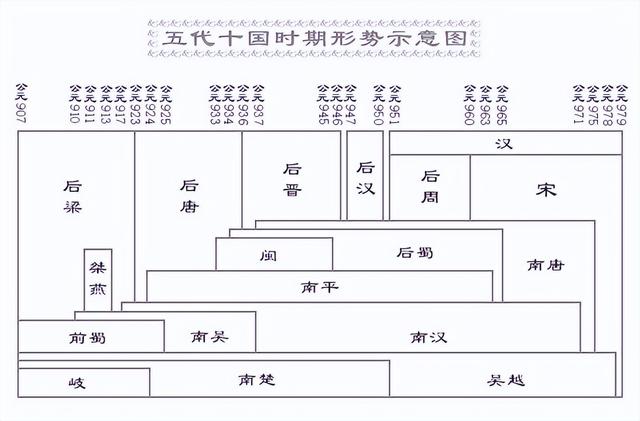 于是这场混战愈演愈烈,到最后已经演变成了后梁、后唐、后晋、后汉和后周这五个国家,这就是五代十国中的“五代”。