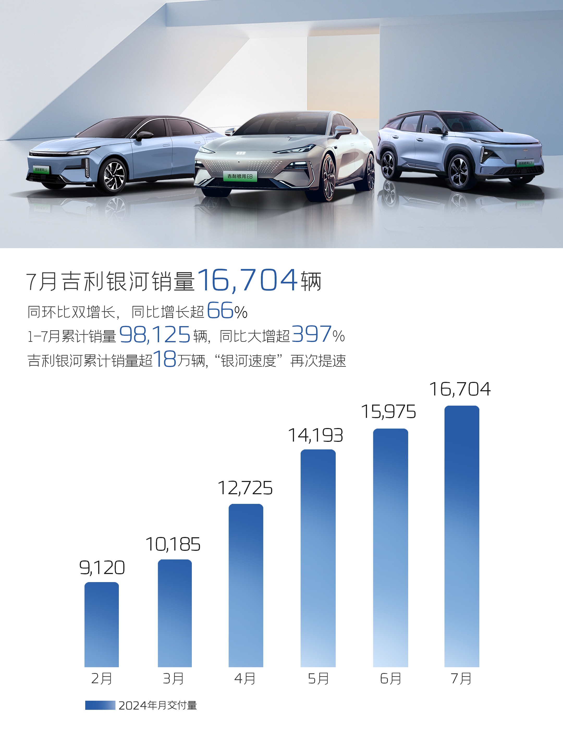 8月1日,吉利汽车集团发布最新销量数据。吉利汽车7月新能源销量达到59051辆,同比增长约58%。其中,吉利银河7月销量16704辆,同比增长超66%,环比增长约5%,已连续5个月销量破万。