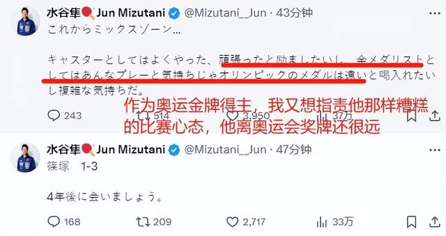 不过张本智和的前辈水谷隼并没有给师弟面子,他在赛后非常不满日本丢掉奖牌,在个人社交媒体上写道:“作为解说员,我想鼓励他说干得好,努力了。但作为奥运金牌得主,我又想指责他那样糟糕的比赛心态,他离奥运会奖牌还很远。我现在心情很复杂。”