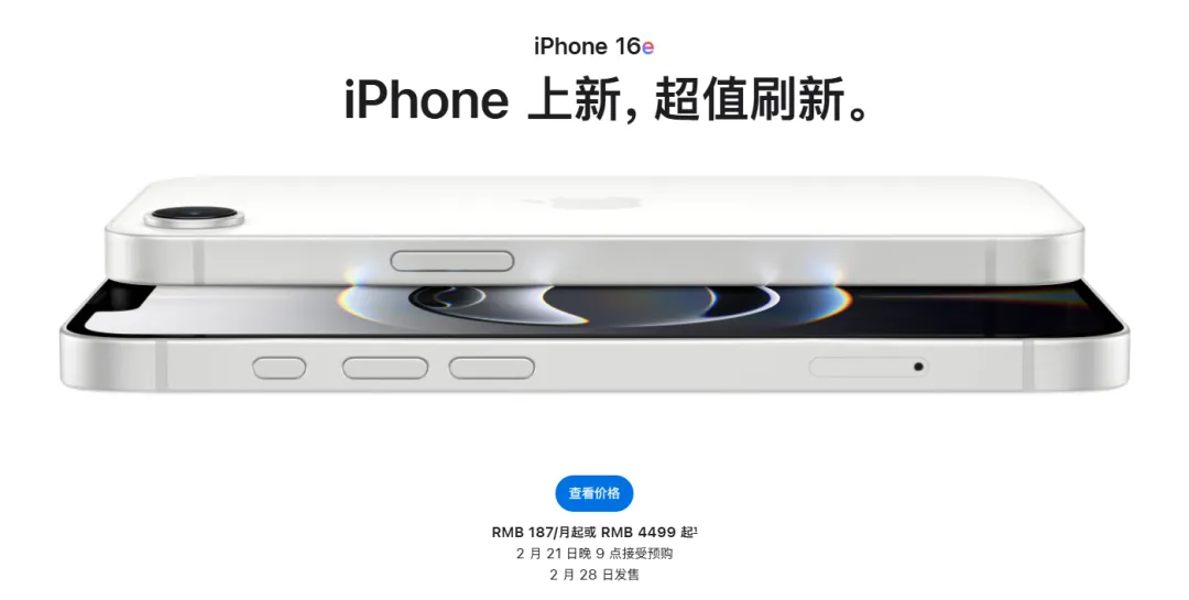总结iPhone 16e就是一句话:最便宜的苹果 AI 手机,搭载全新自研芯片,“iPhone14清库存升级版”,卡贴机终结者,国补 3999 元可入手,苹果官网2月21日晚9点开始预购,2月28 日发售,同时大家期待的iPhoneSE4并没有来。