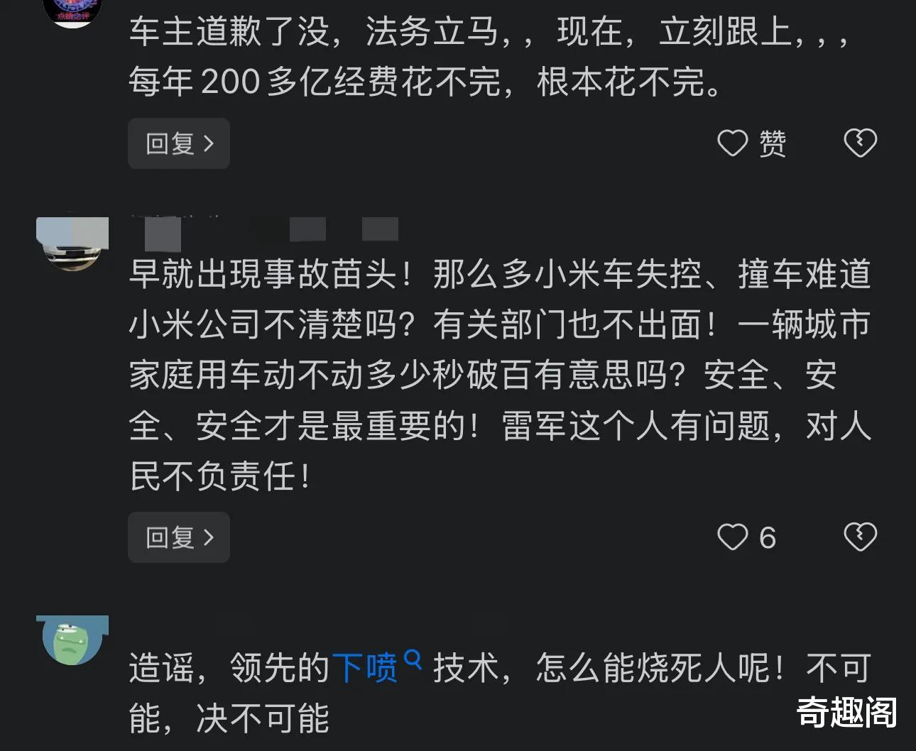 有很多网友针对这起事故,也在评论区发表了各自的看法和意见。一部分网友认为,如果按照小米客服的说法,那么主要原因应该不是车门锁死的问题;还有网友说,车祸的原因也是多个因素导致的,不能一概而论。