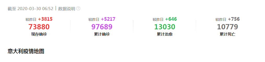 意大利疫情自3月份以来,持续爆发,截止当前累计确诊97689例,逼近100000例,尤其是死亡病例,高达10779例,成为海外死亡人数最多的国家;尽管我国分多次派遣医疗专家和团队驰援意大利,但意国疫情确实严重,加上医疗物资短缺、人们的防范意识淡薄等原因,意大利疫情仍旧不容乐观;