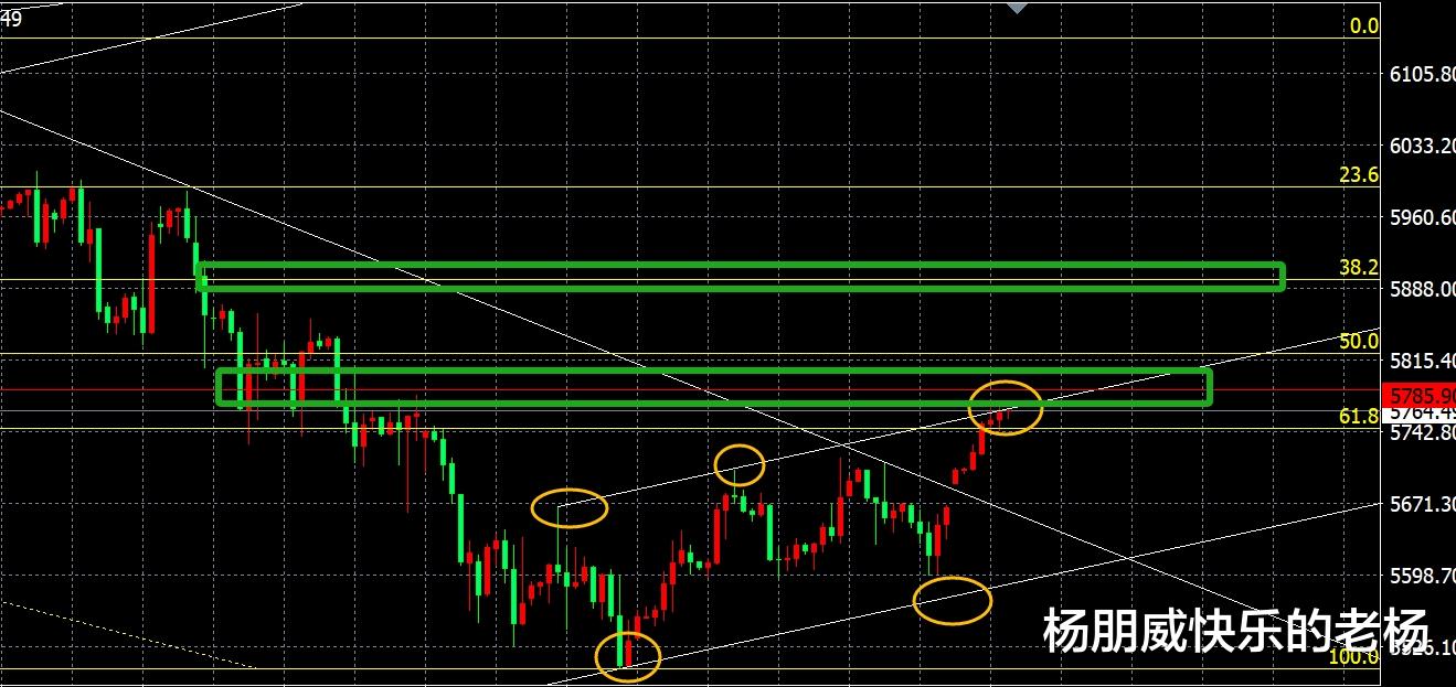 标普期货,昨天高位震荡,目前强阻力区域,今天继续关注冲高回落,5500以来的反弹面临调整。压力5820及5880-5900区域,冲高空为主。
