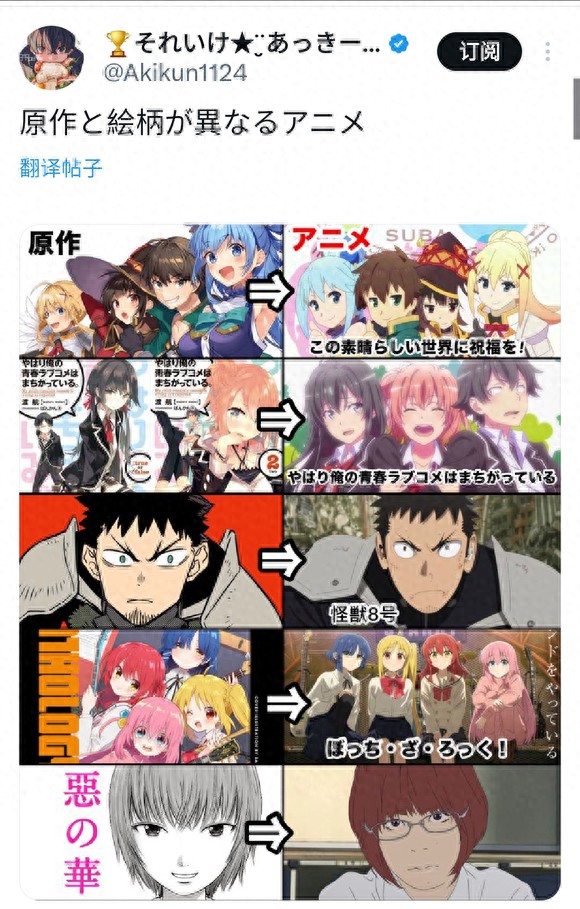 我们都知道,漫画、轻小说或者游戏是第一次和大家见面的原作,自然在第一眼中是和动画有所区别。很多时候,原作的人气和独特魅力更加适合制作动画,也就造成了和原作区别特别大,推上最近就有读者在吐槽:改编成动画后,差距也太大了。