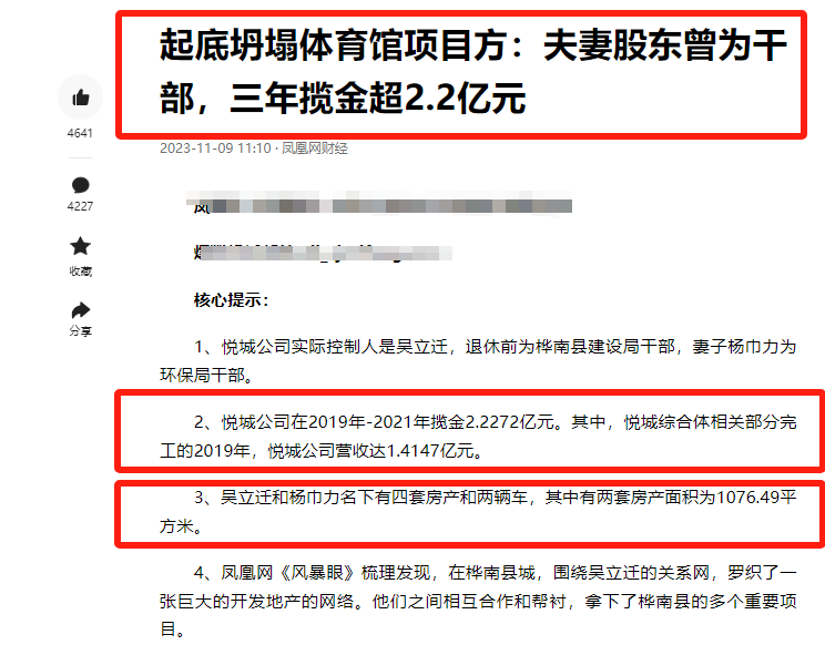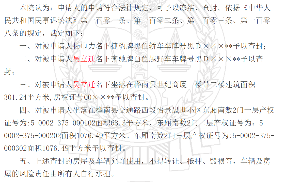 因为将工程承包,部分的承包公司因为没有拿到最终的款项,将悦城房地产开发有限公司告上法庭,根据此前的判决书来看,吴立迁夫妻二人名下共有4套房被查封,总面积达到2500平米,除此之外,夫妻二人还拥有两辆豪车。