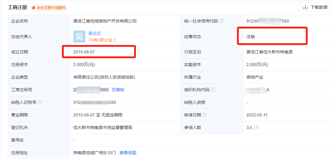 而名义上的开发商为环保局和建设局干部夫妻档持股公司-黑龙江悦城房地产开发有限公司,这家公司早在2022年5月份就已经注销,在该公司注册的历史资料中,并没有发现该公司具备地产建设资质。