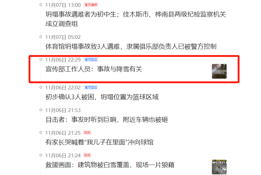 事故发生后,有记者前往事故发生地,看到该体育馆未坍塌的残余部分馆顶有积雪覆盖,据当天发布的天气预报显示,11月6号有暴雪红色预警,按理说,如果有暴雪天气,体育馆这样的地方是不允许营业的。