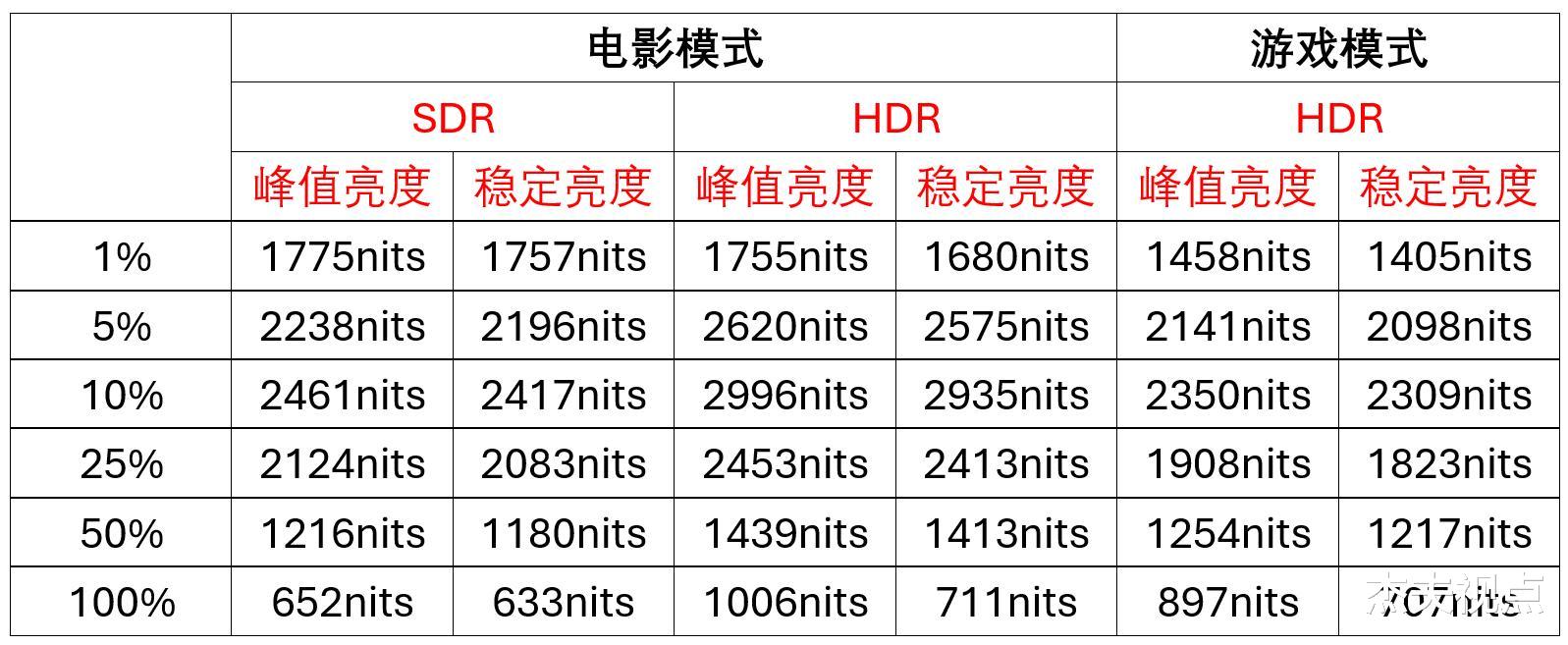一般用户常用的标准、电影模式、游戏模式以及Filmmaker模式基本都会低于这个亮度,我们测试了电影模式以及游戏模式下各个APL窗口的峰值亮度和稳定亮度,大家可以作为一个参考。