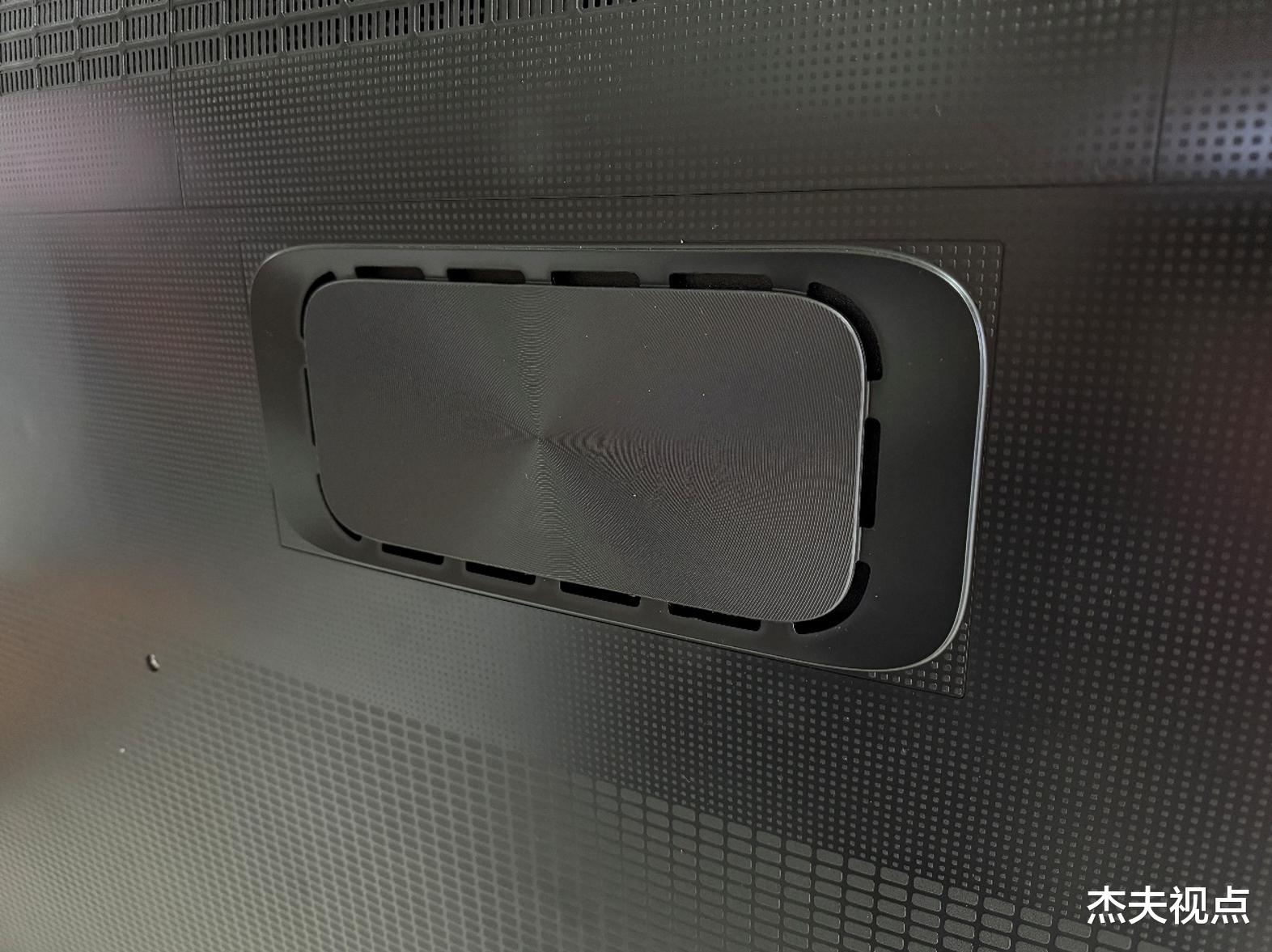 电视背部是传统的黑色塑料材质,左右两侧偏上的位置设计了单独的出音口,进一步强化的侧边扬声器的发声,同时背部中间有独立带装饰的低音单元,上方有较为密集的散热孔。