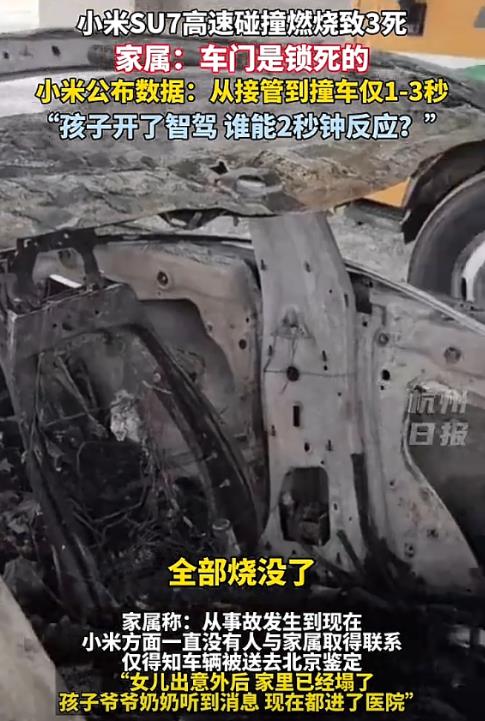 此时,车辆发生了爆燃,三名女生没能逃出来,家属们认为,是因为小米车门和车窗被锁死,没有办法打开,所以才导致她们被活活烧死。