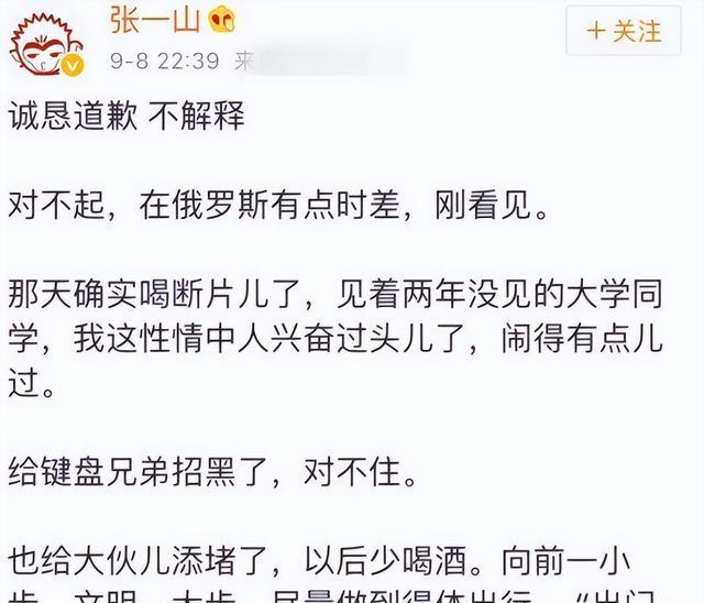 不过很快张一山就对这件事做出了解释:称那天喝断片,闹得有点过,随后向大家道了歉,这件事才堪堪过去。