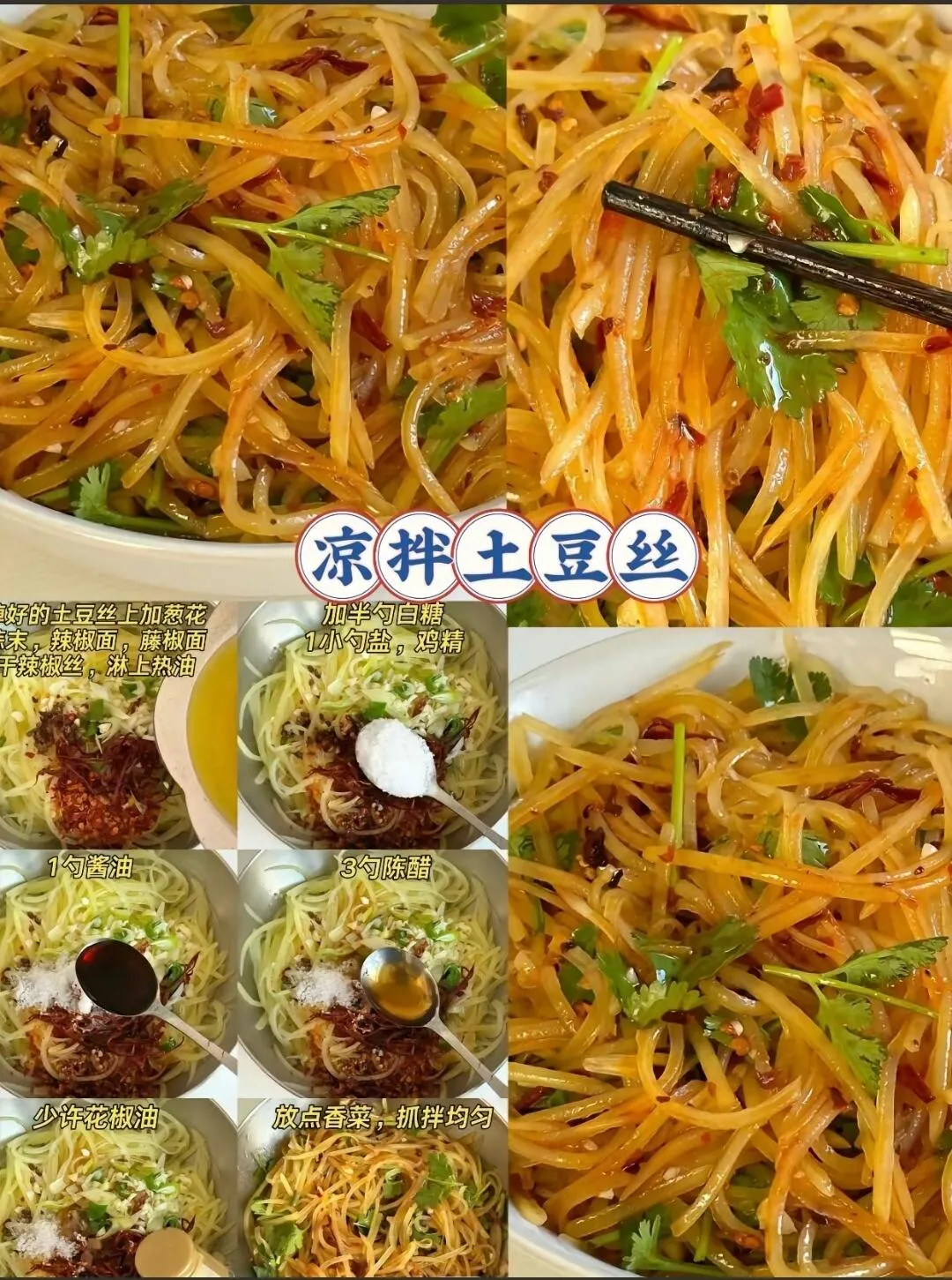酸辣可口的凉拌土豆丝,低卡无负担。只需要将土豆丝焯水后,加入葱花、辣椒面、藤椒面,淋上热油,再加入酱油、花椒油、白糖、盐和鸡精,最后放入香菜抓拌均匀即可。这道菜不仅美味,还能让你在减脂期间享受酸辣的口感哦!