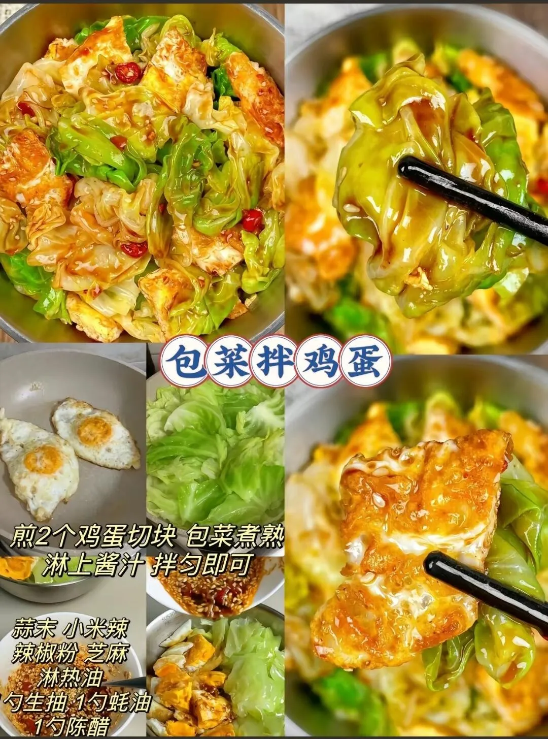 这道菜营养满满,清爽又饱腹。只需要煎两个鸡蛋切块,将包菜煮熟后淋上酱汁拌匀即可。酱汁的制作也很简单,只需要蒜末、小米辣、辣椒粉、芝麻淋上热油,再加入生抽、蚝油和陈醋即可。这道菜不仅美味,还能让你在减脂期间保持营养均衡哦!